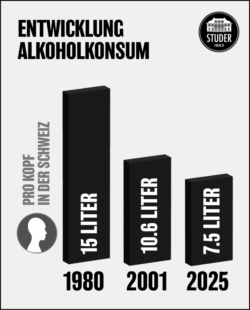 Der bewusstere Konsum zeigt sich in der Entwicklung des Alkoholkonsums pro Kopf in der Schweiz.