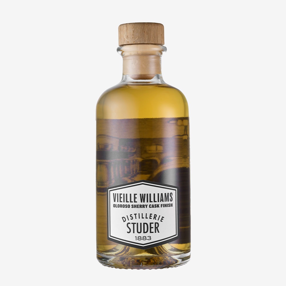 Der Vieille Williams Oloroso Sherry Cask Finish wird ausschliesslich aus sorgfältig ausgewählten Williams Birnen, die im sonnenverwöhnten Wallis reiften, hergestellt. Die Früchte werden von Hand selektiert, gemaischt und anschliessend destilliert. Durch die Lagerung erhält das Destillat die komplexen Geschmacksnoten der ex-Sherry Oloroso Fässer. Zur Abrundung wird das gelagerte Destillat leicht gesüsst. Das klare Williams-Aroma harmoniert mit den Sherry-Noten aus dem Fass, kommt aber trotzdem klar zur Geltung und wird durch die leichte Süssung geschmacklich abgerundet.